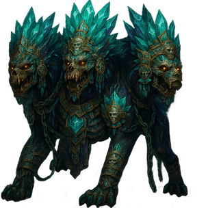 Her prized possession, a cerberus disruptor enchanted by necro-ice crystals. It stands 5 ft/ 152 cm tall form feet to shoulder. This certified good boy was a gift given to her by her mother Xandera. It fights tirelessly with the will of its master Kimilzamat. Each of the three heads work in unison to maul their opponents with large teeth. Delighting in the taste of blood. It uses its overwhelming strength to pin opponents to allow the princess to interrogate others.